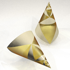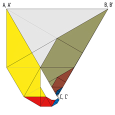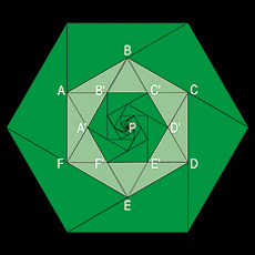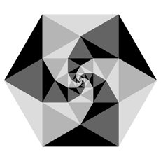 The semi-spidron is half of the spidron, consisting of increasingly densely packed and smaller regular and isosceles triangles. The sequence can also be continued in the opposite direction, with ever larger triangles, ad infinitum. It seems to me that this composition, or to use the term that is more customary in mathematics, this "triangle complex", or the half of it I call a semi-spidron is the foundation for all the other shapes with their interesting spatial and almost "spatially flexing" properties which – according to the comments and the feedback I get – promise novel developments in the fields of geometry, physics and other branches of science.